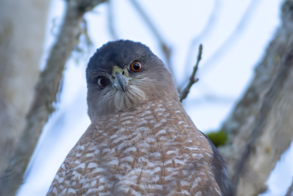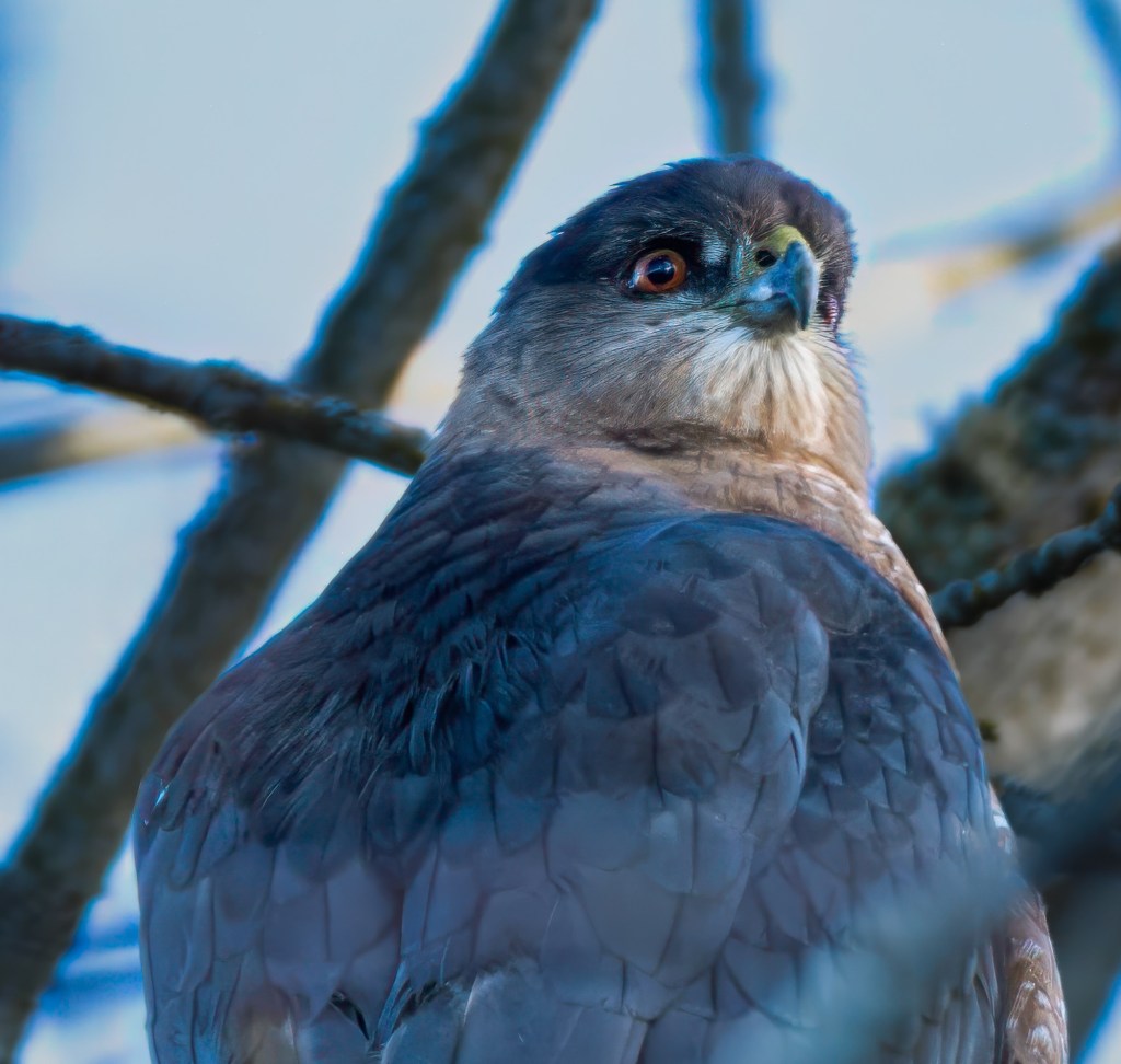 In what appeared to be a poorly thought out strategy, the Coopers Hawk (photos below) landed next to a small black rabbit that was feeding next to some bushes. Before the hawk was able to make its next move, the rabbit had already disappeared into the bush. It happened so quickly that I didn’t get a chance to get a shot off.